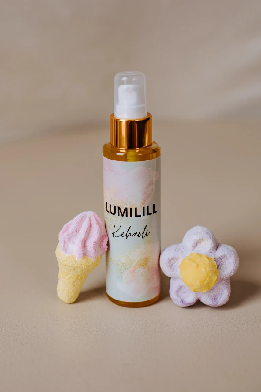 KASUTAMINE: Kanna kuivale nahale ja lase imenduda. Enne päikese kätte minemist, kanna nahale spf kaitsega päikesekaitsekreem ning seejärel Lumilill kehaõli.