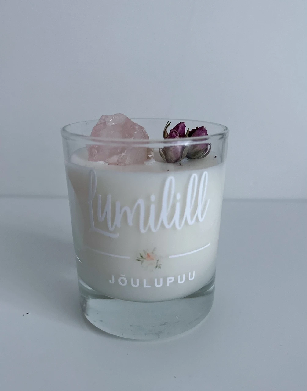 Kristalliga kaunistatud jõuluhõngulised küünlad. Kristalliks on armastuse kristall - roosa kvarts.